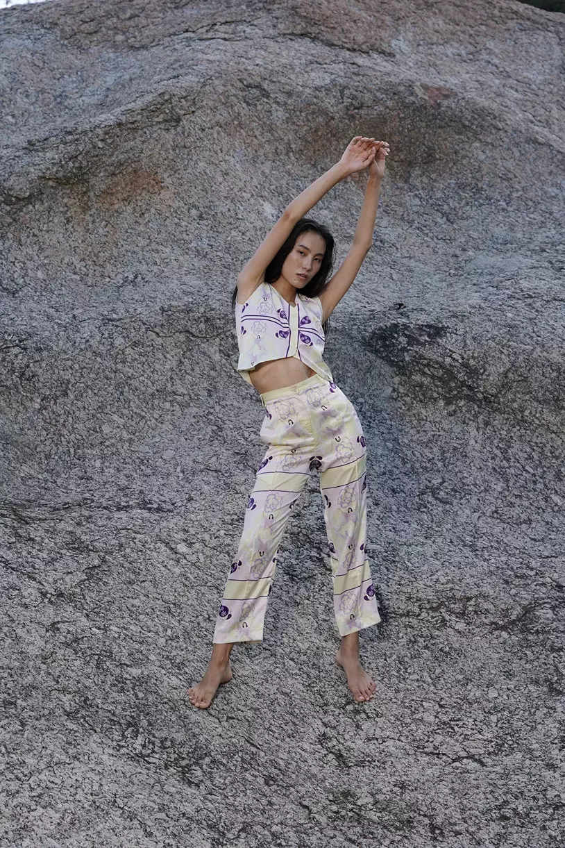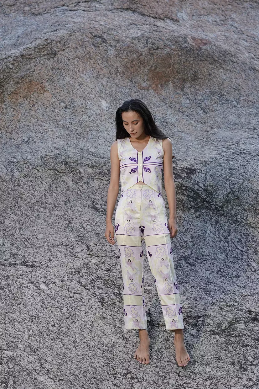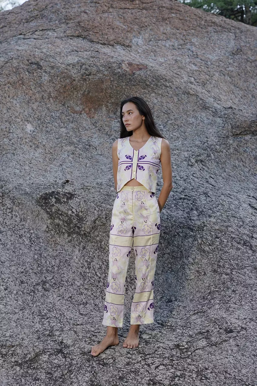 A sleek and stylish co-ord set featuring a short waistcoat paired with high-waisted, straight-fit cropped trousers. This set offers effortless chic with a “slip on and go” design—perfect for any occasion that calls for a polished, modern look. The waistcoat can also be worn separately with a pair of jeans for a more casual, toned-down vibe. Crafted from luxurious sandwash satin, this set boasts a smooth, lustrous finish and is digitally printed for vibrant, precise details.