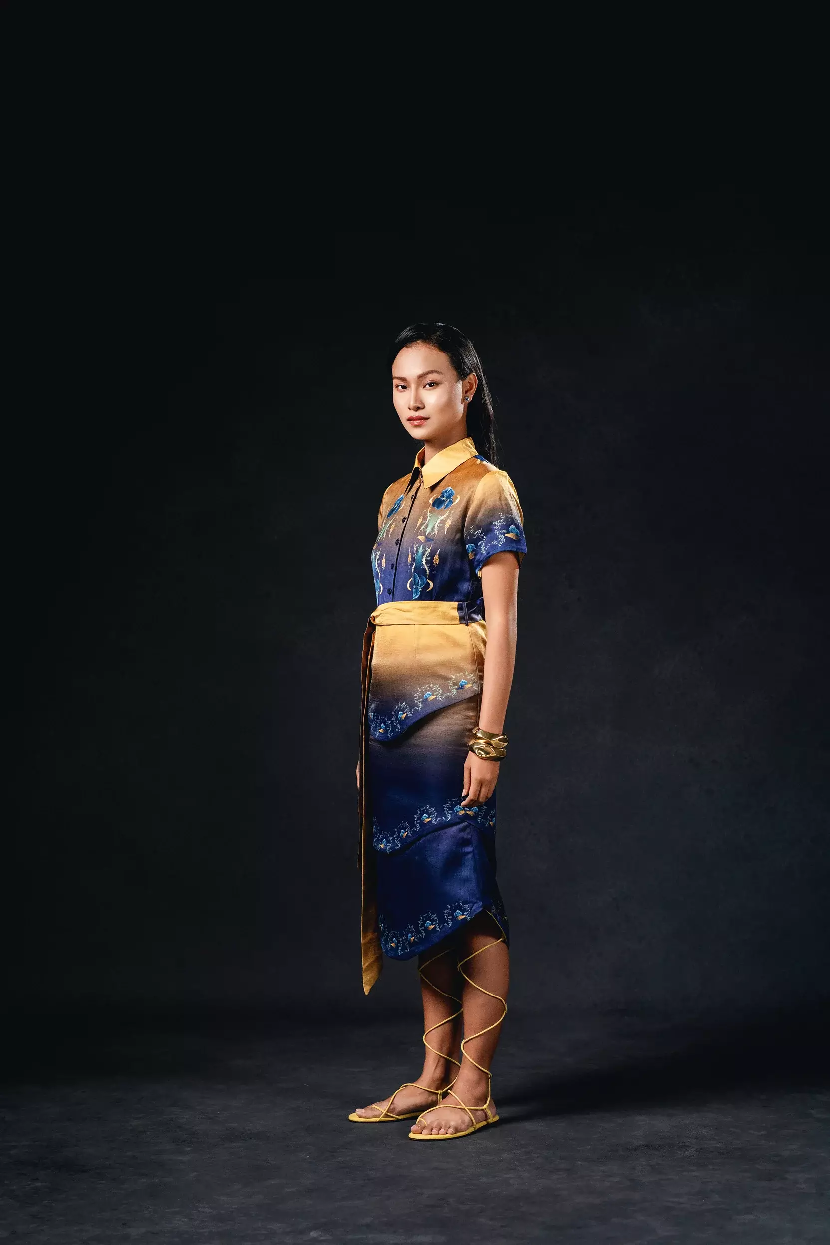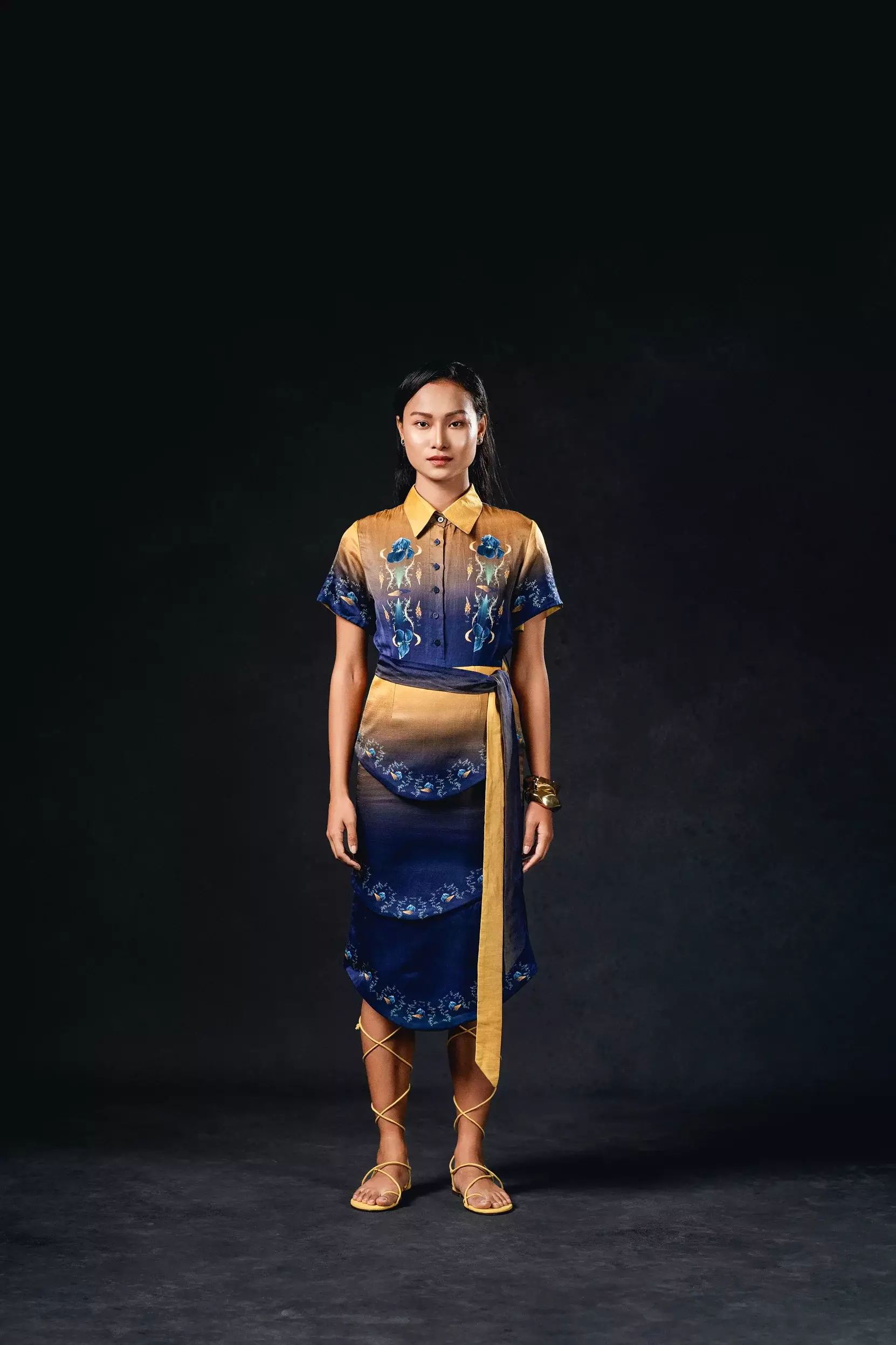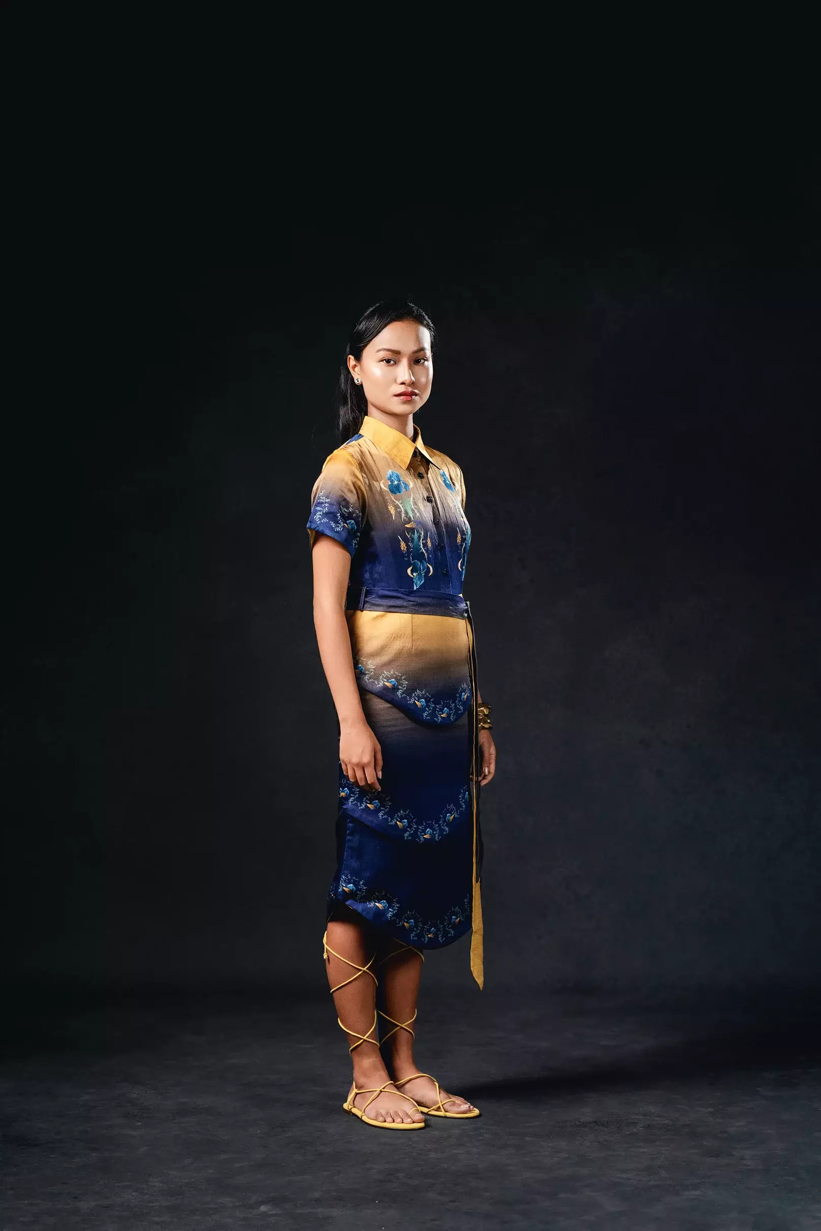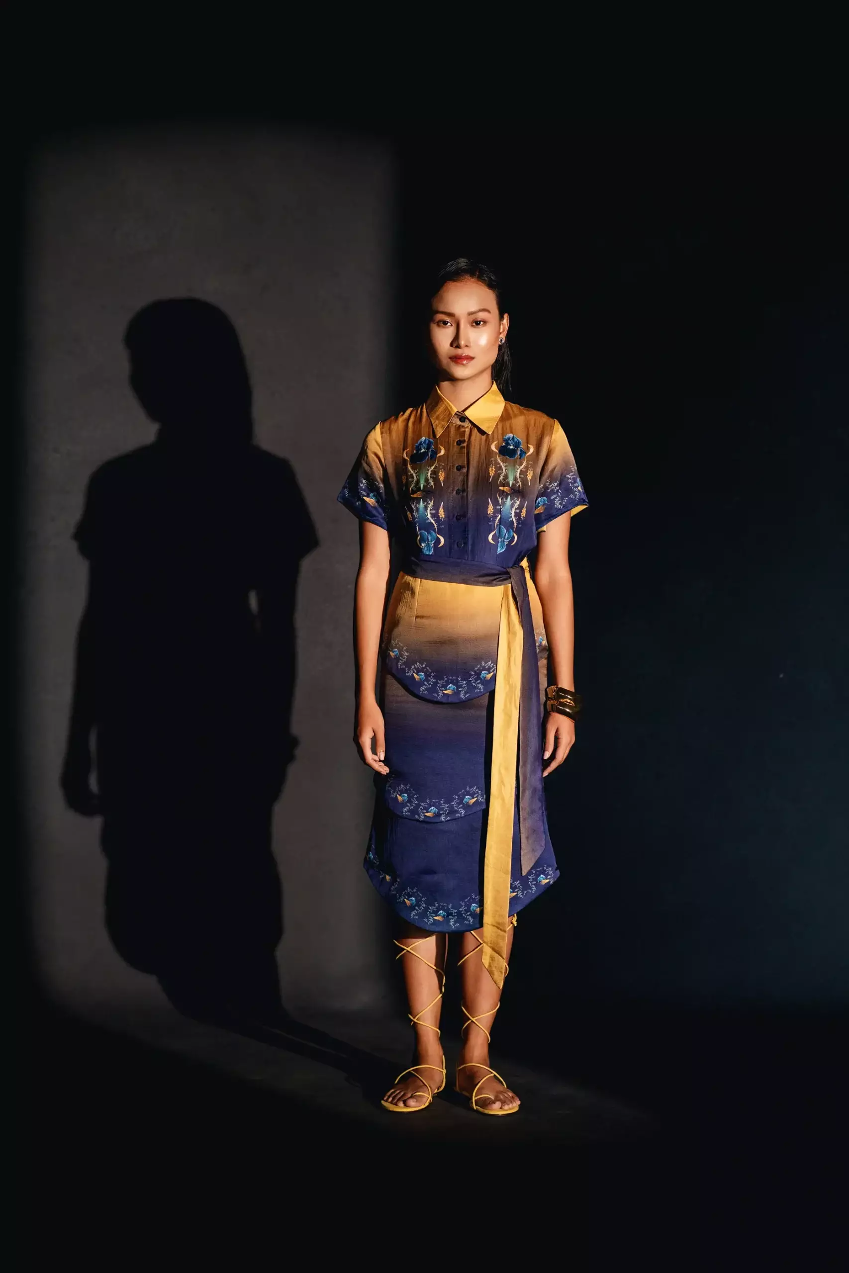 A classic shirt-style, three-tiered midi dress crafted from luxurious Linen Silk, designed to provide both sophistication and comfort. The dress is fitted to the body, with each tier perfectly aligned to create a stunning, scale-like effect that flatters your figure. Paired with a tie-up belt to accentuate the waist, this dress offers versatility—you can easily swap the belt for one of your own to create a different look. The ombre hues add depth and a touch of modern elegance, making it the perfect dress for a special dinner or occasion.