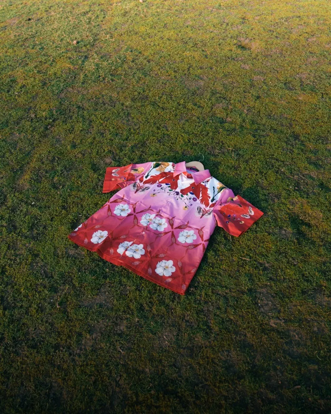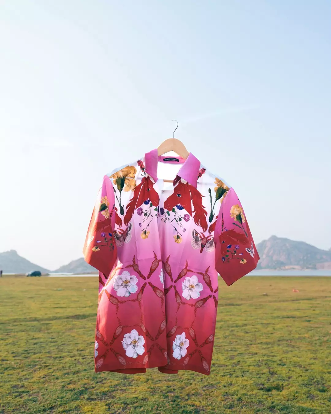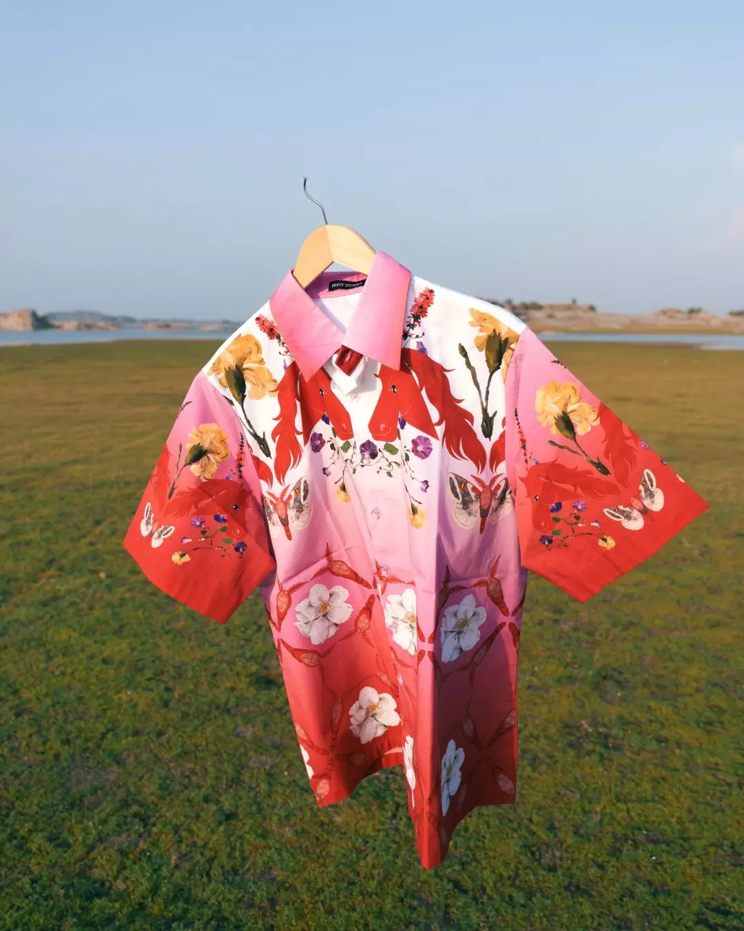 Crafted in fine linen-silk, the Dreamer Resort Shirt features a classic stand on collar and button-down front. The soft Ombre green base is elevated with a bold red rose motif — a subtle statement for warm-weather escapes. Tailored in a relaxed fit for effortless summer styling.