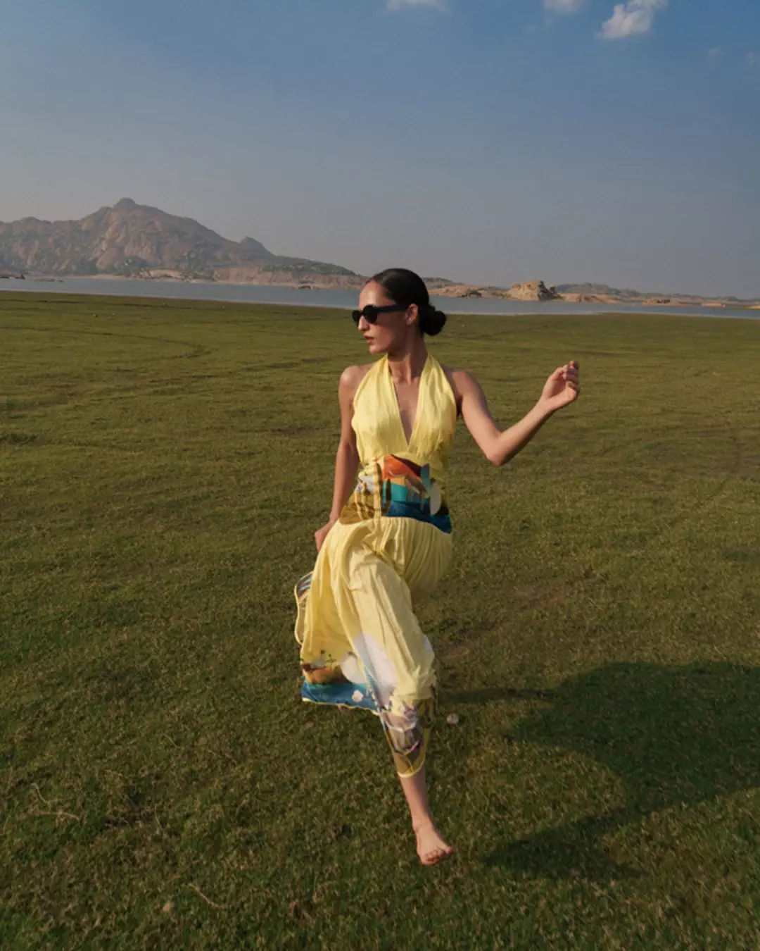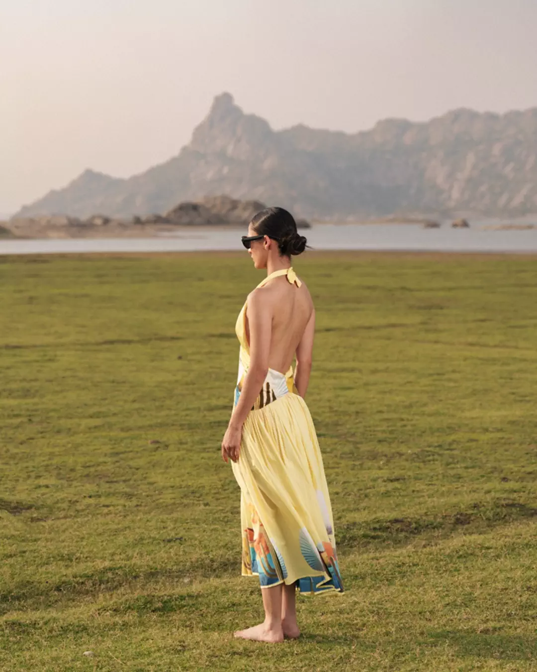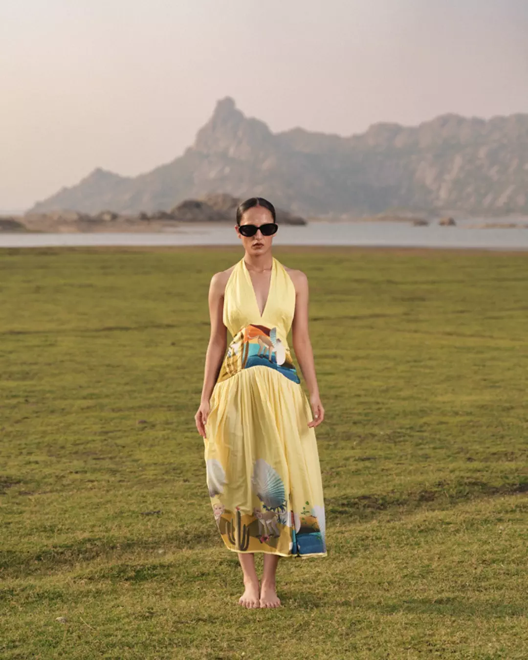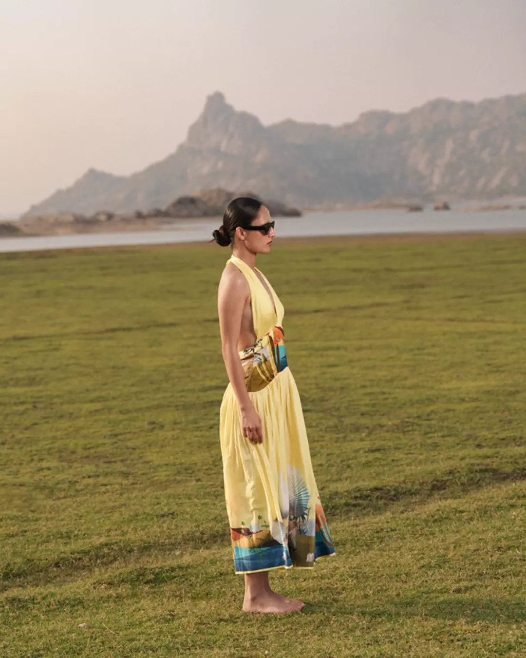 The Sunset Halter Midi Dress is designed with a structured linen-silk bodice and a soft, flowy cotton skirt. Featuring a halter neckline, deep open back, and form-fitting top with style lines, it balances structure with fluidity. Finished with a concealed zipper at the back and a halter button closure.