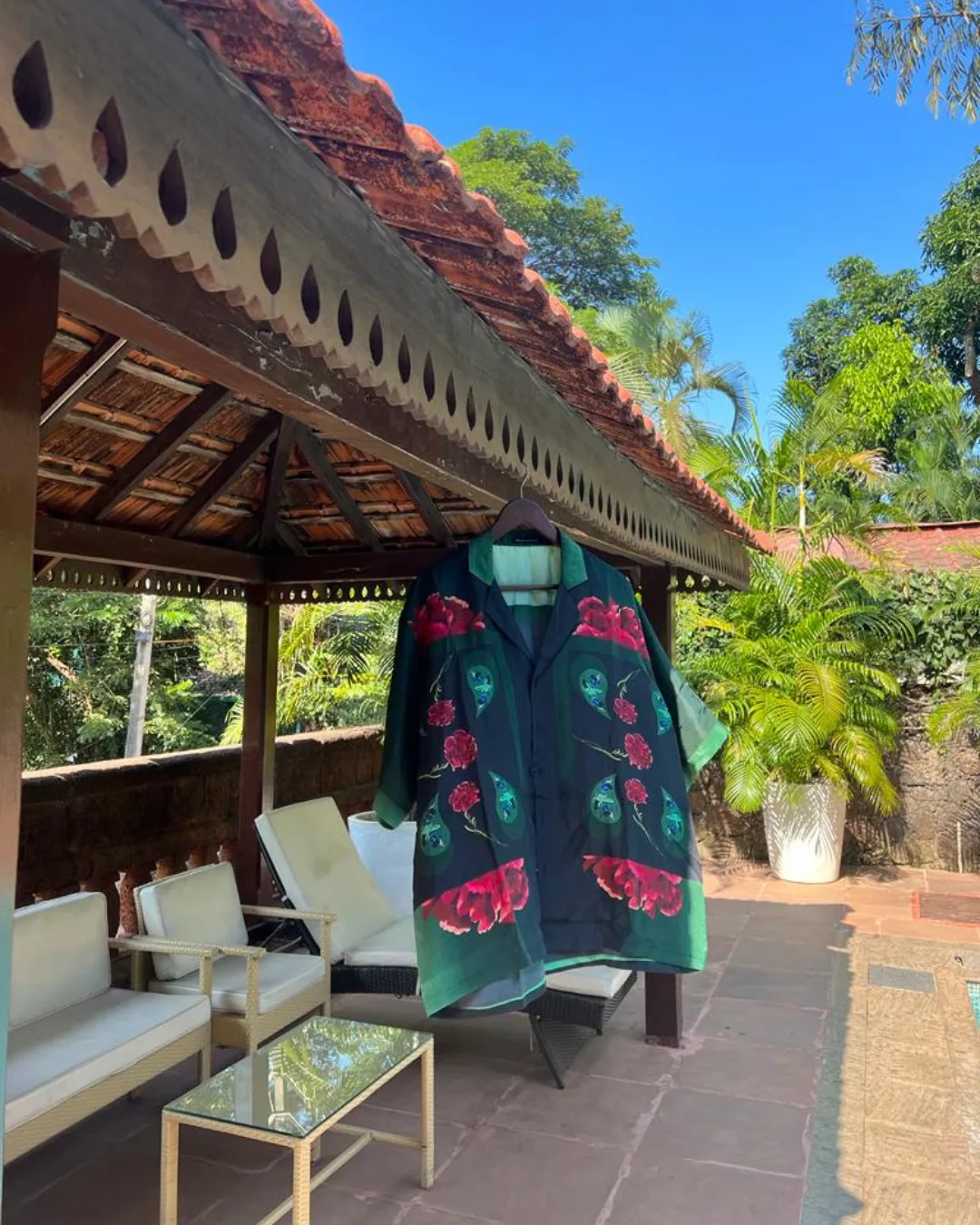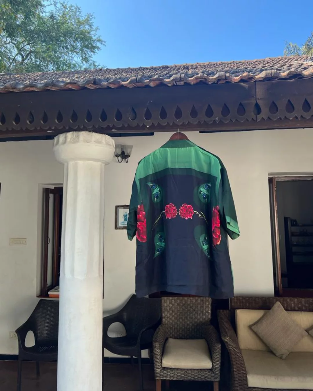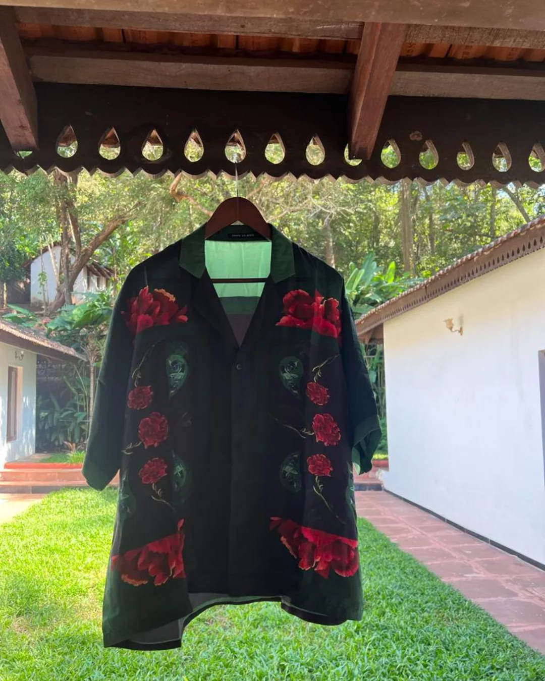 Crafted in fine linen-silk, the Dreamer Resort Shirt features a classic Cuban collar and button-down front. The soft Ombre green base is elevated with a bold red rose motif — a subtle statement for warm-weather escapes. Tailored in a relaxed fit for effortless summer styling.