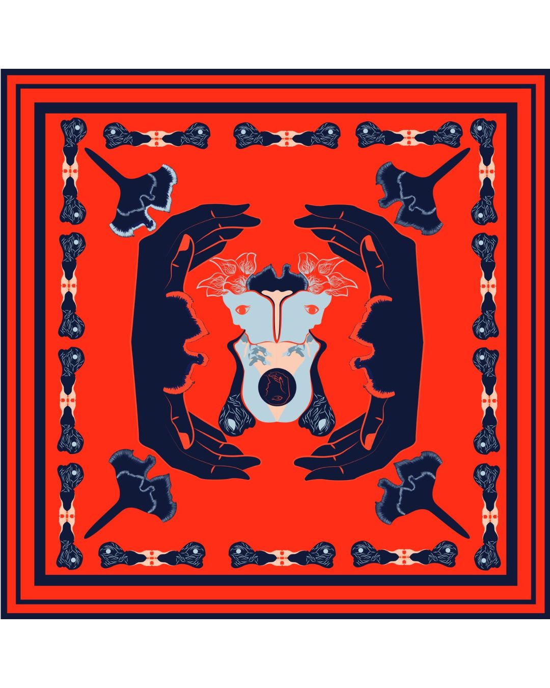 The mind is getting flooded with a chaotic dream. Our dreamer is trapped where humans have turned into snakes and flowers that don’t look familiar anymore. She tries to run but they have formed a circle around her, she looks up in the sky for help and there is this Medusa gawking at her. In panic she wakes up. Shop our artwork as a scarf or as a framed art piece.