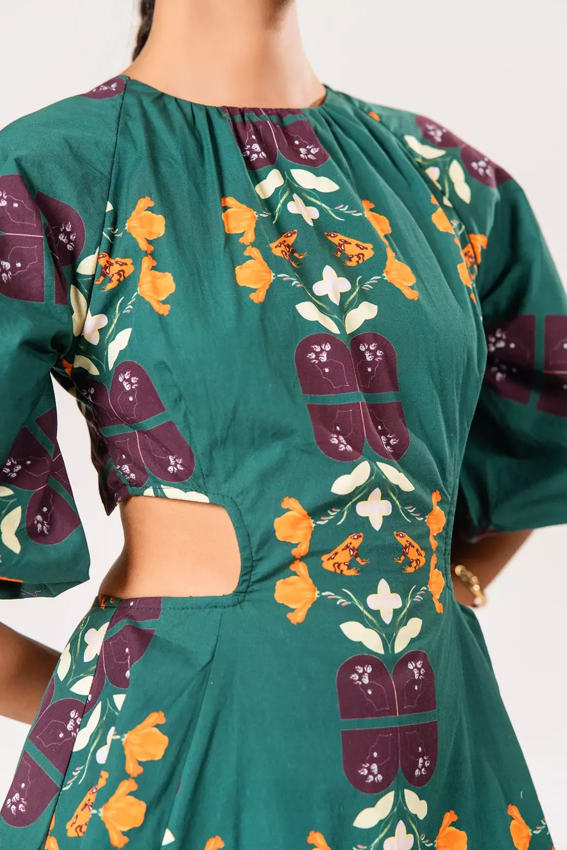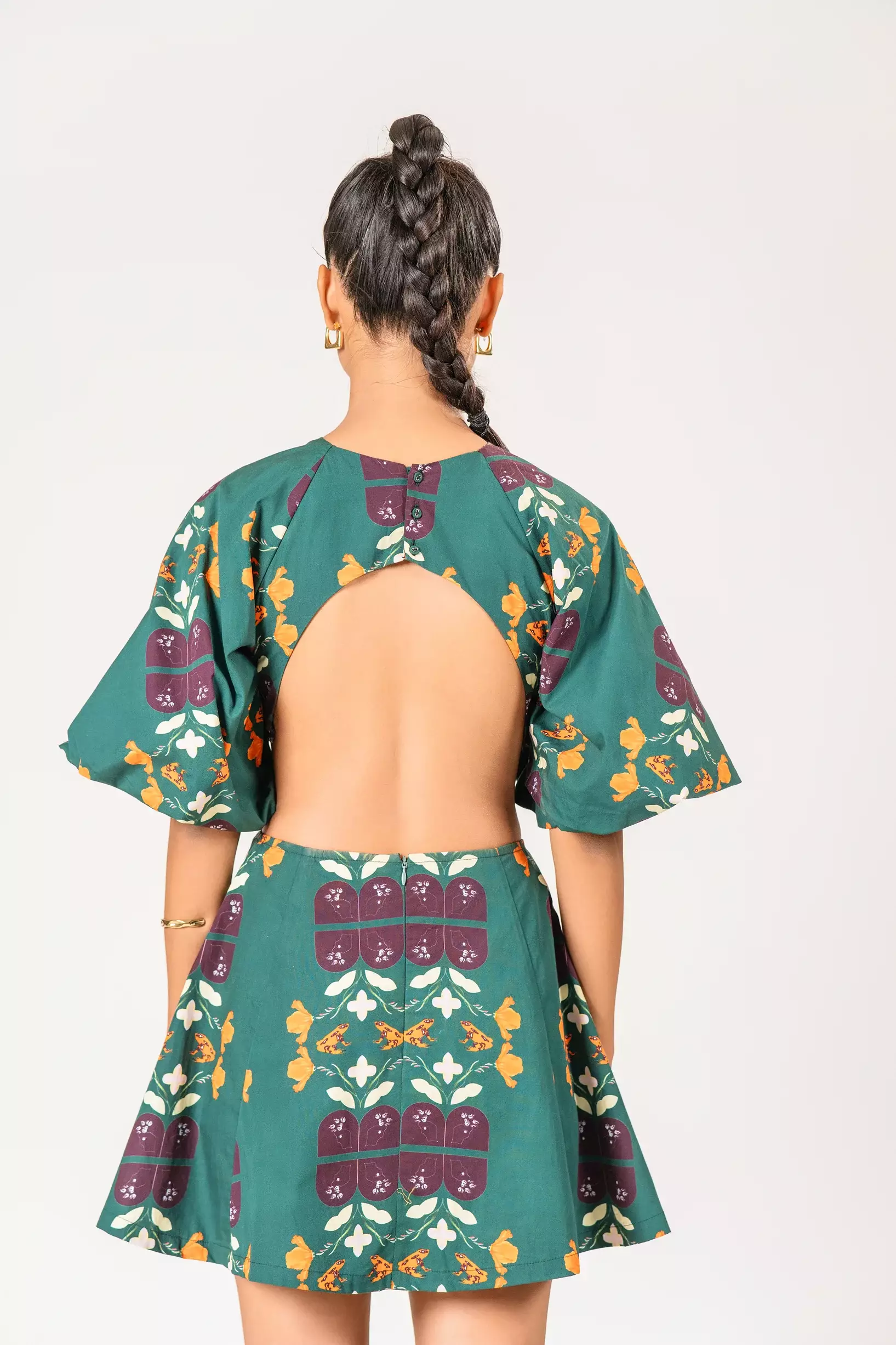A bold and flirty mini dress that effortlessly blends sexy with playful. Featuring voluminous sleeves and a daring open back with a cut-out detail, this dress is designed to make a statement. Fitted on the top to hug the figure and flared at the bottom for a flattering A-line silhouette, it’s perfect for a vacation date night or a holiday evening out. The digitally printed design brings vibrant energy, while the thin cotton lining ensures comfort and breathability.