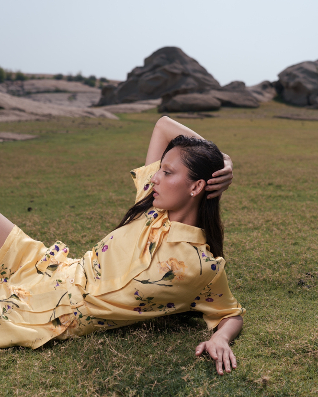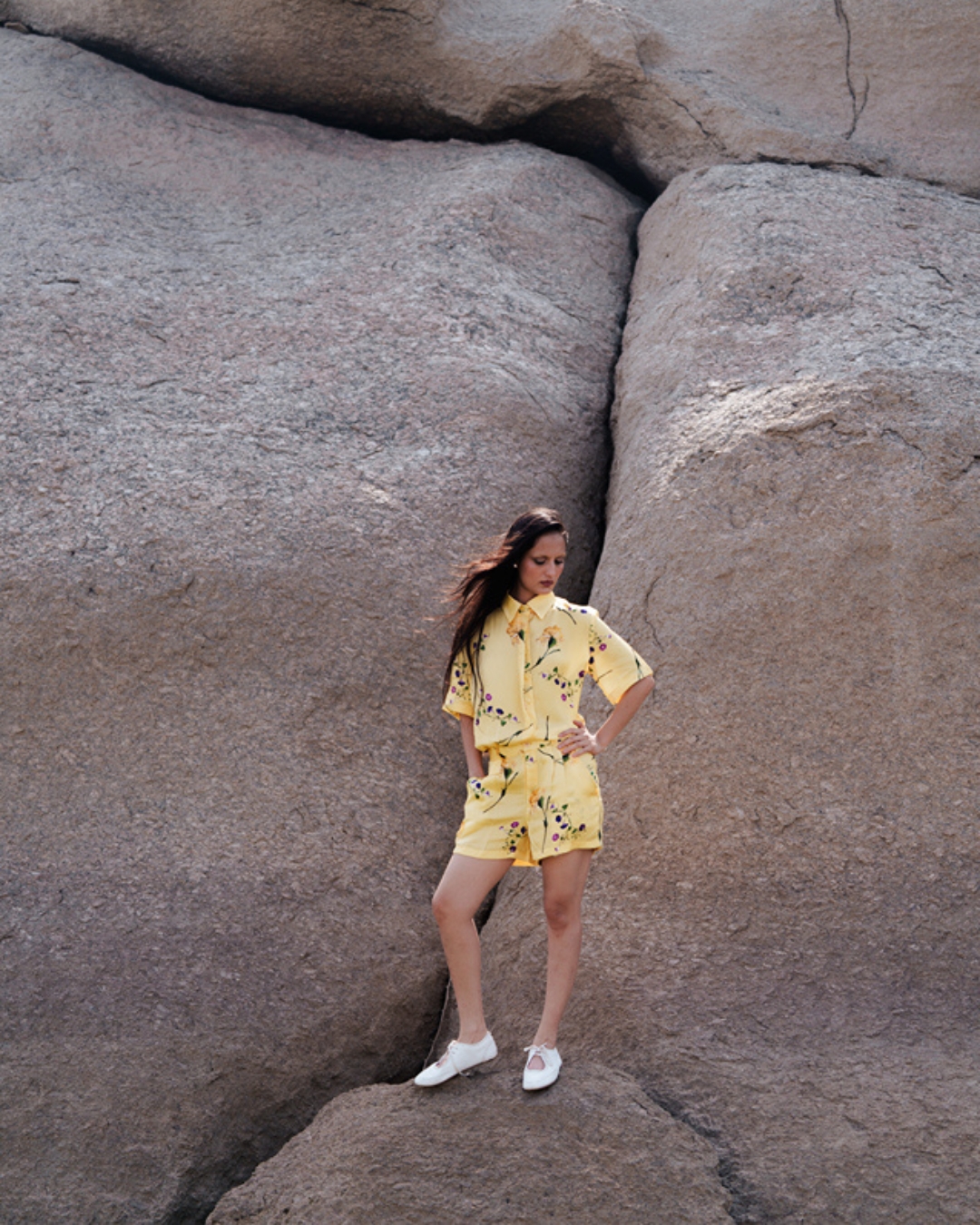 Bright, bold, and beautifully tailored the Viola Romper is your sunshine statement in one sleek silhouette. Crafted from a luxurious linen-silk blend, this yellow jumpsuit romper captures the essence of effortless confidence and clean design. Designed with precision, it features a concealed placket that gives the front a smooth, streamlined finish, while the classic button structure at the top adds a touch of timeless polish. The bottom half is thoughtfully designed with functional pockets, merging practicality with style.